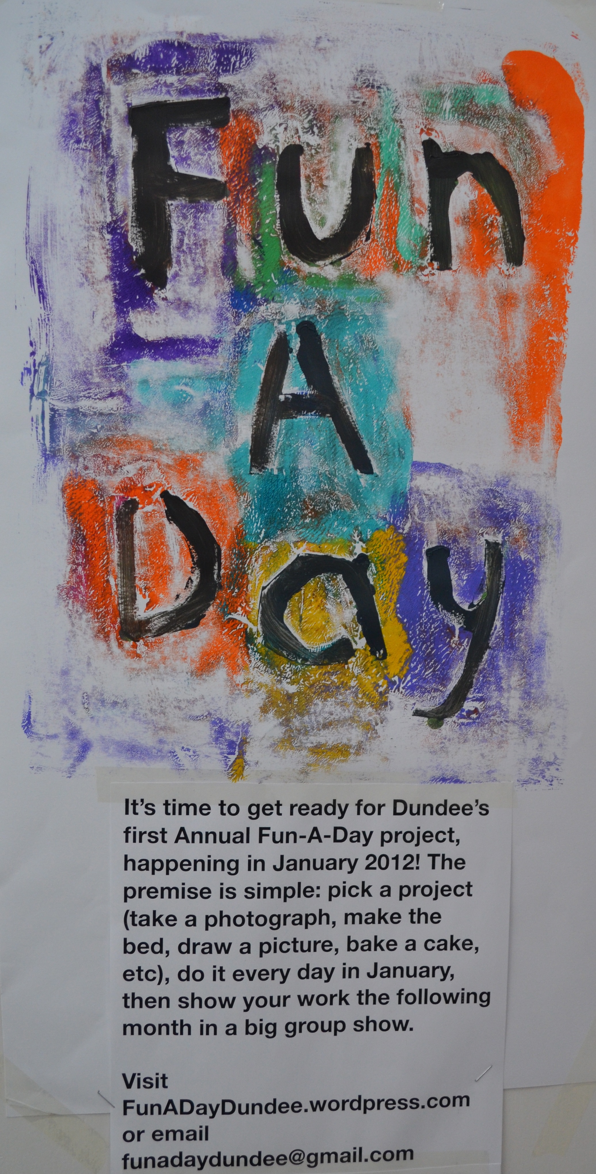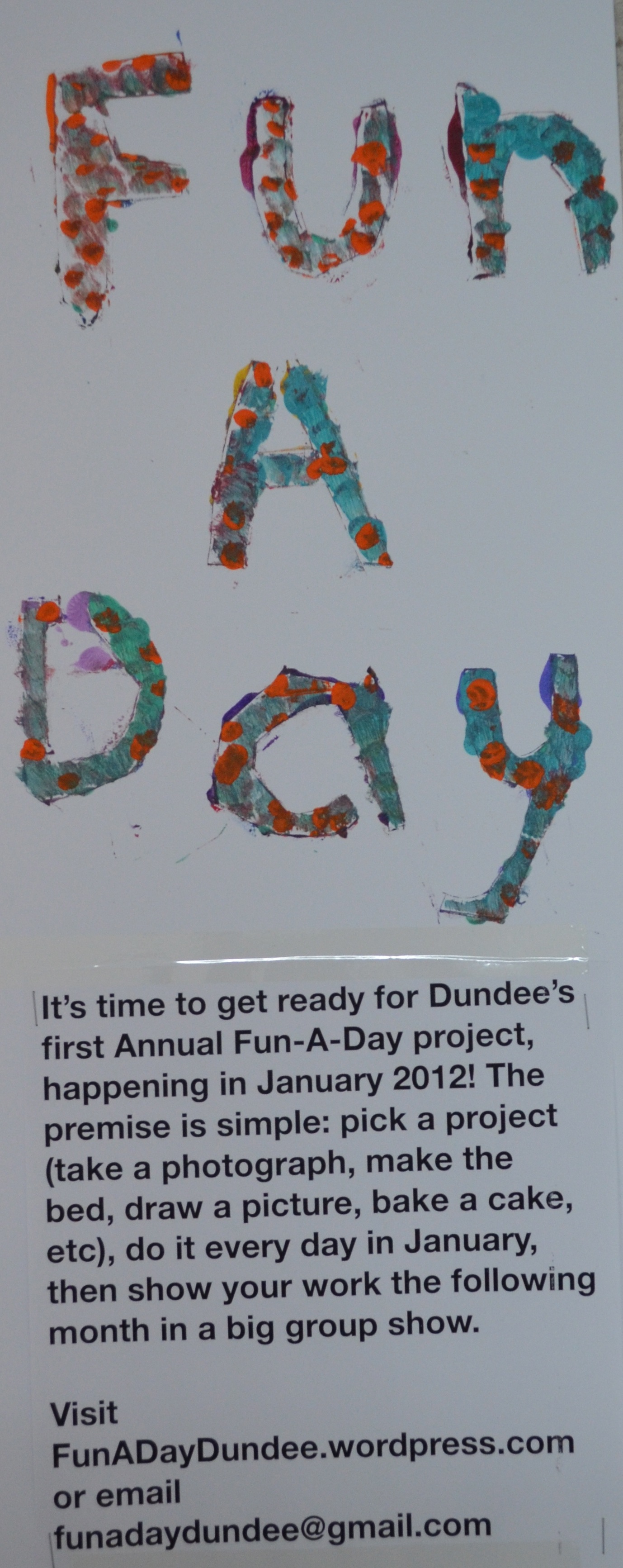 Help us get the word out! With only a couple weeks before January 1, we need your help to share the Fun-A-Day idea with Dundee artists of all sorts. We’re waiting on a confirmation from the venue, the details of which we will let you know as soon as it is official. Finally, we need folks who can help hang a show and promote the event. Interested? Let me know in the comments or send me an e-mail at funadaydundee@gmail.com.