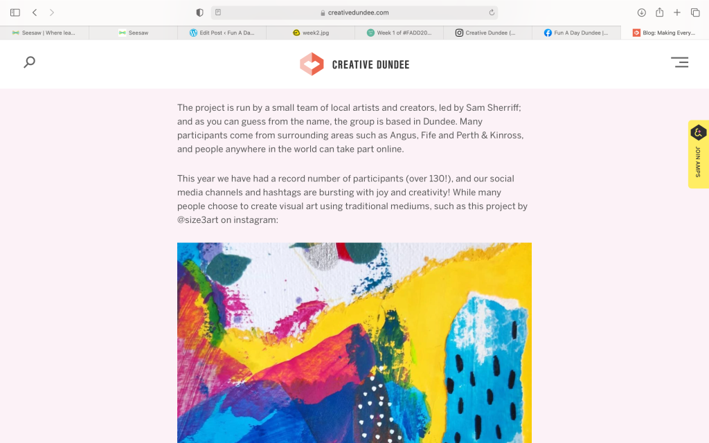 In the last week, one of our assistant coordinators, Hannah has had the privilege of writing a blog about Fun-A-Day for Creative Dundee. In this she quite accurately states: “It is the connection and community of Fun A Day Dundee that makes the group really shine. There is no competitiveness, just lots of people having fun together.” You can read the rest of this blog here on the Creative Dundee website where you will also be able to see a sample of images from this year’s projects.