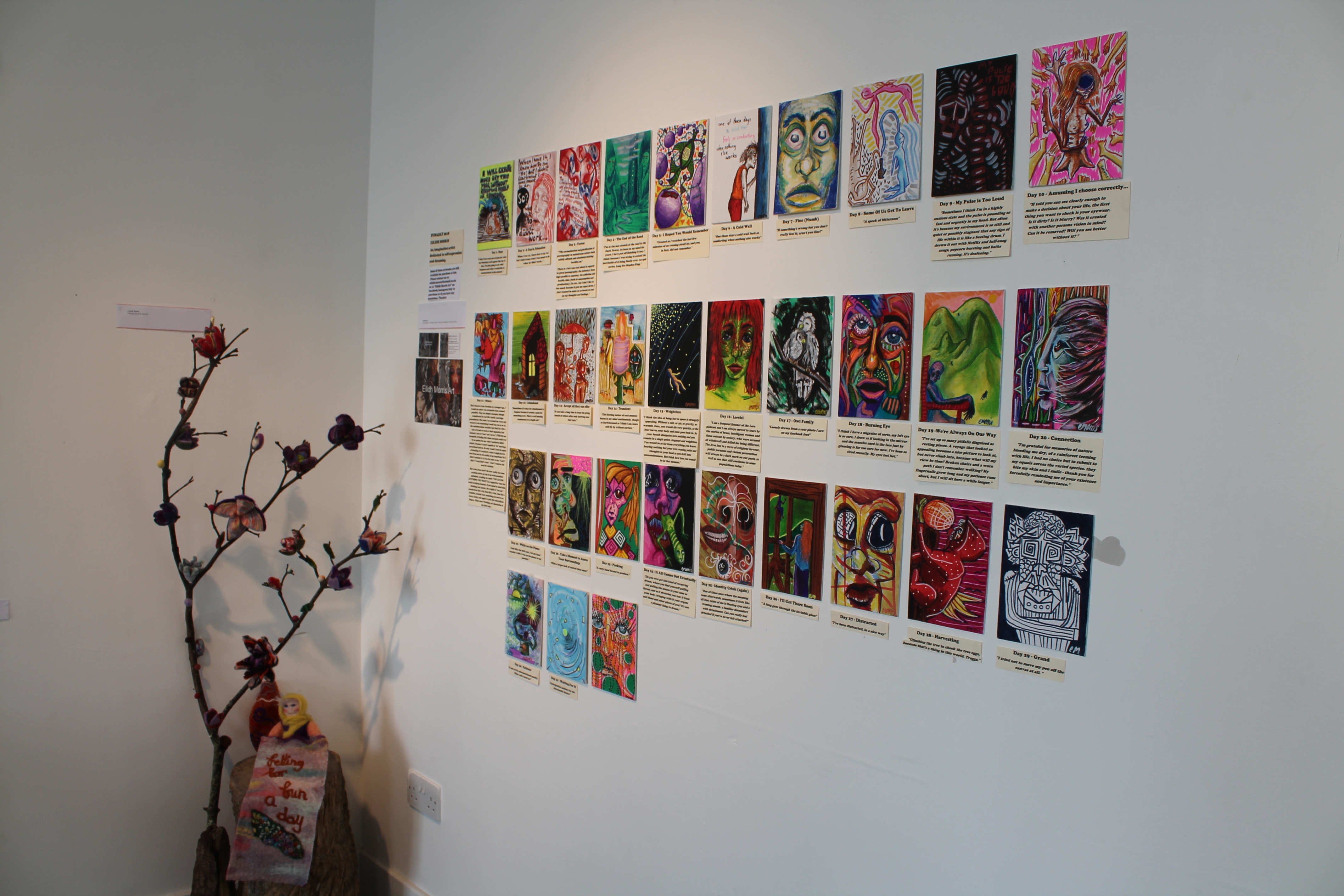 Each year we showcase FADD projects made by participants in a fun, casual and exciting showcase to the public. We aim to exhibit every project, including those that have 31 individual pieces. We love to share the variety and all the personal stories in the one place. It’s always a fun and inspiring weekend. We also have some of our participants taking part in the form of performances, talking to visitors, sharing their skills at craft stations and helping out over the exhibition weekend. We create a community online over the project, and it blossoms at our public ‘social meets’ and exhibition. Last year, and for our 2020 our showcase we moved it all online providing zoom performances, artist sessions, competitions and activities.
