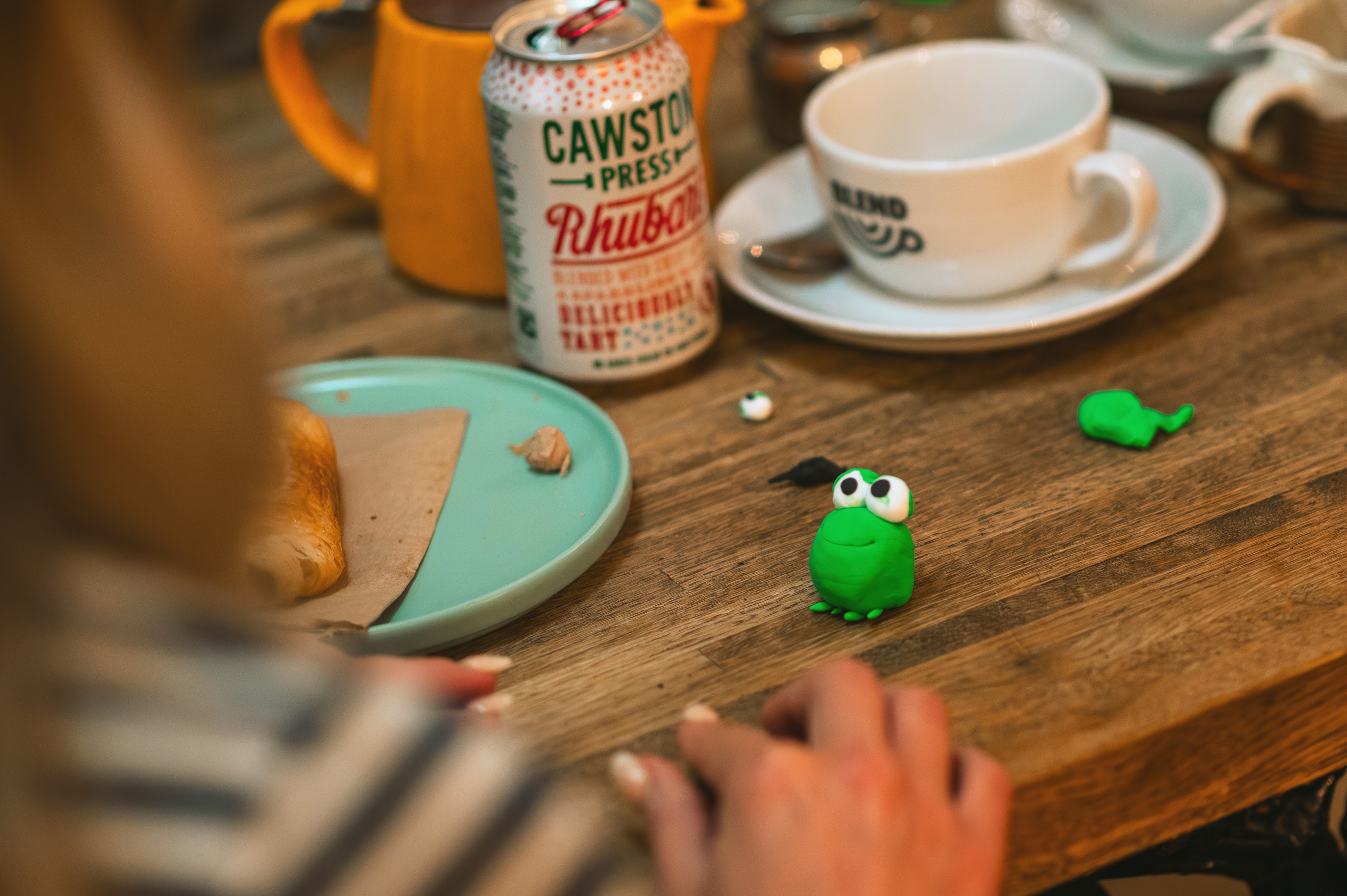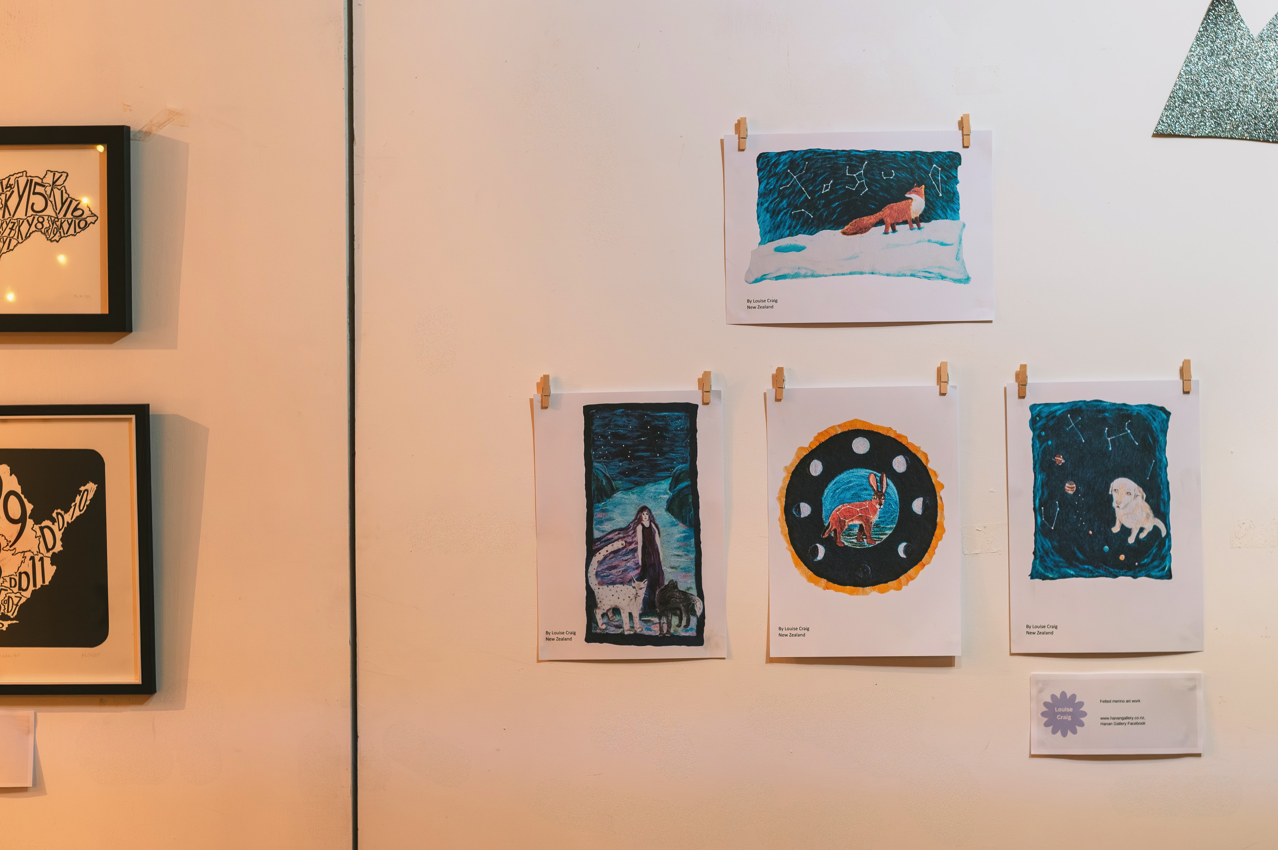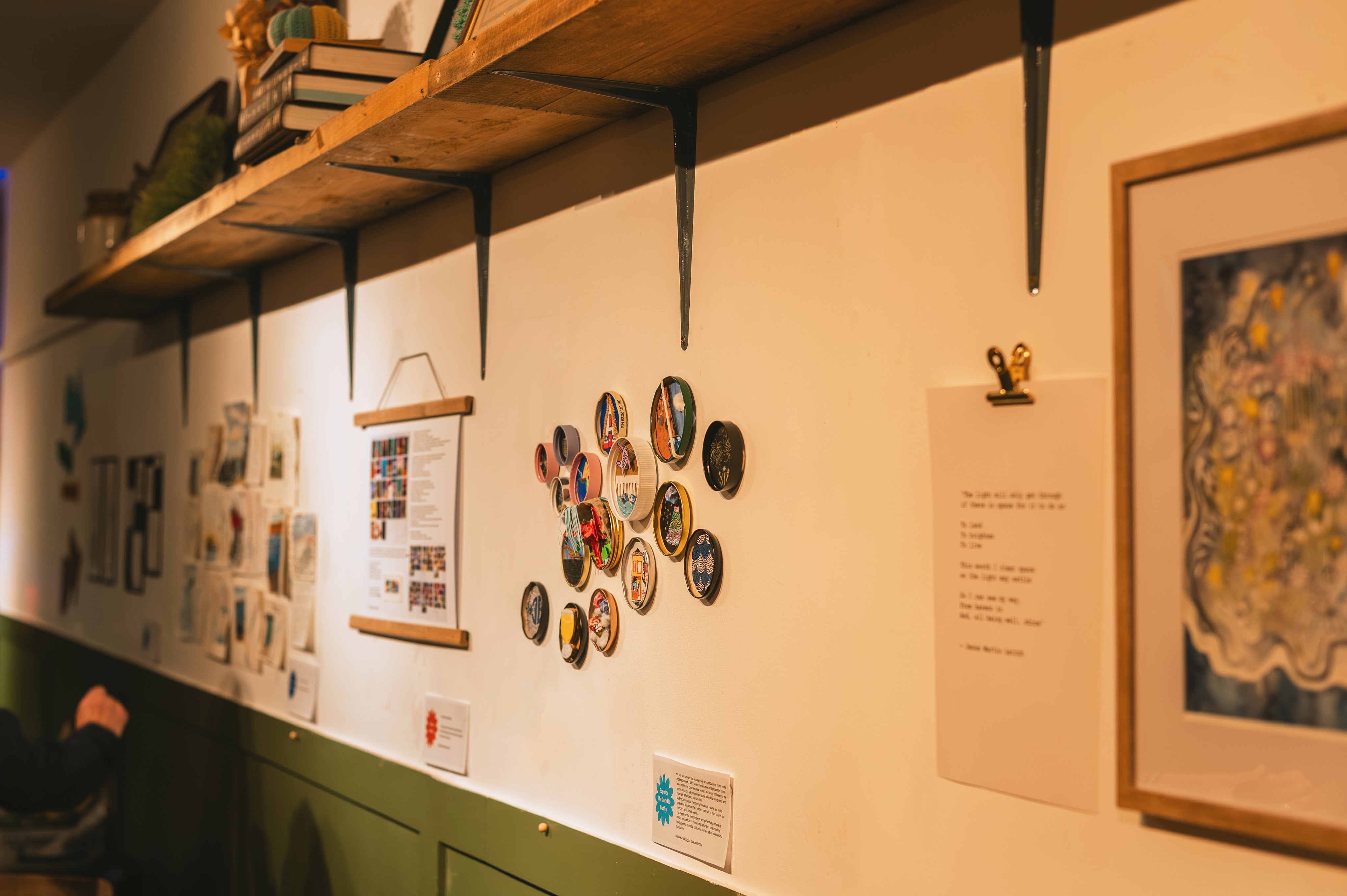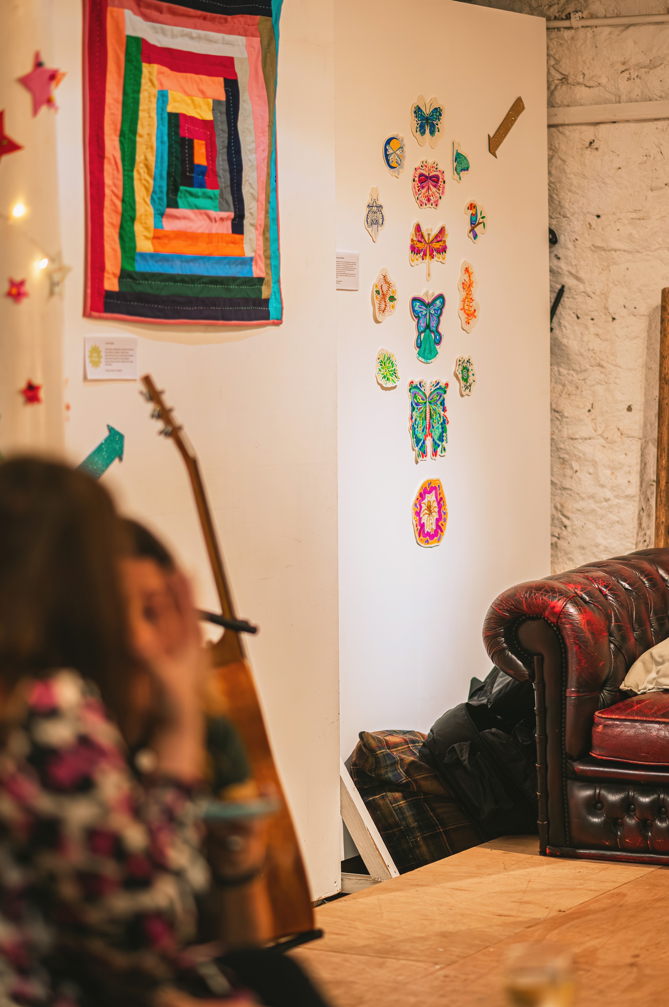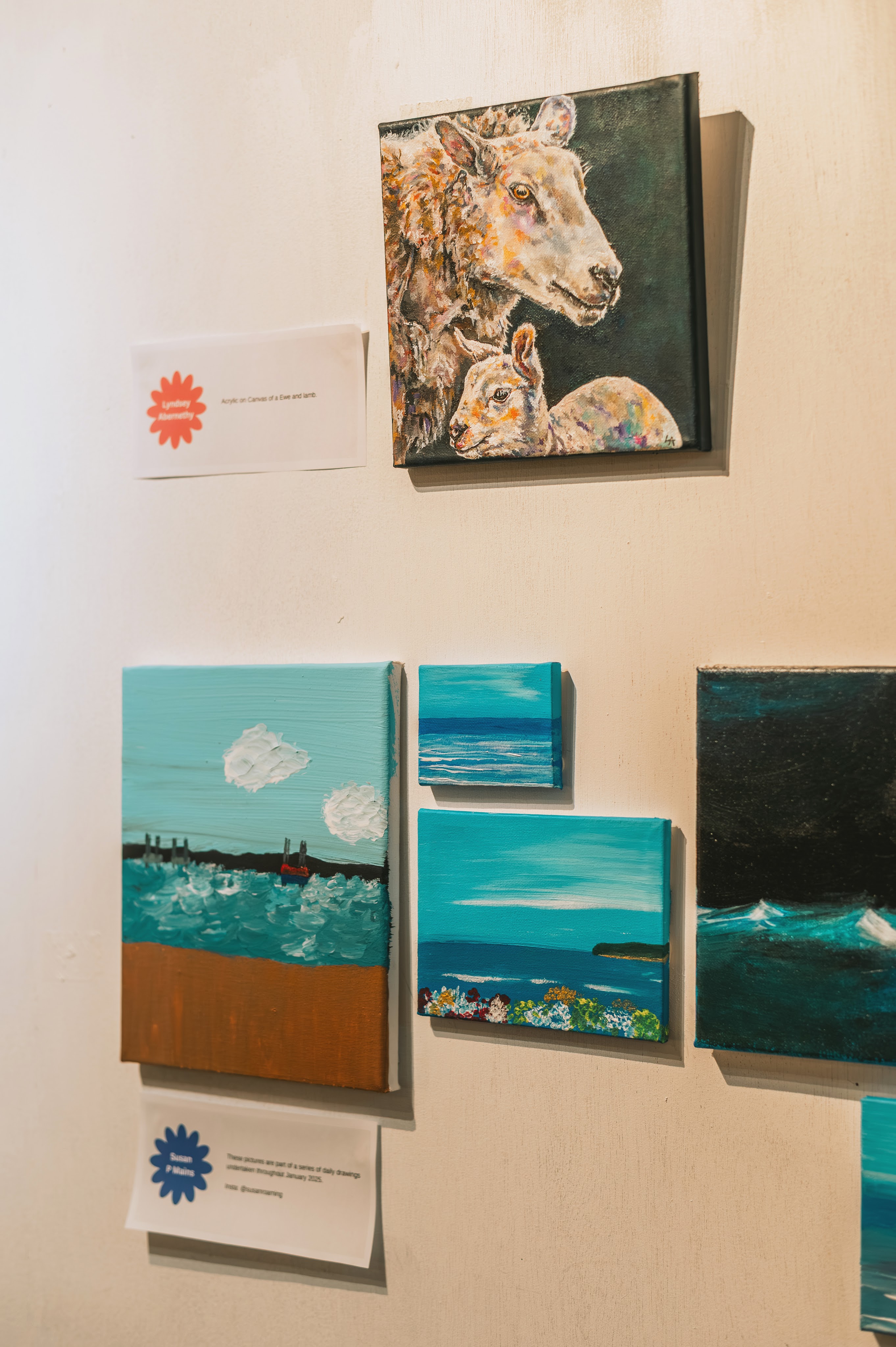 The venue was buzzing with energy as artists, friends, and curious visitors admired the incredible range of work produced throughout January from a whole range of people, local, and far (New Zealand!) From detailed sketchbook entries and inspiring poetry to beautiful crafts, unique textiles, original music, natural sculptures, abstract documentation, and even holiday memories captured in jar lids — the walls overflowed with colour, imagination, and joy. And so no one had FOMO, we also hosted a crafty station of clay modelling, colouring in and craft.
